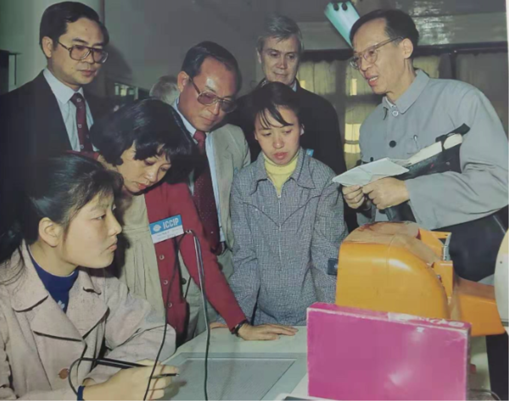 1983年,計(jì)算機(jī)科學(xué)技術(shù)系教授楊芙清(前排左二)在輔導(dǎo)研究生