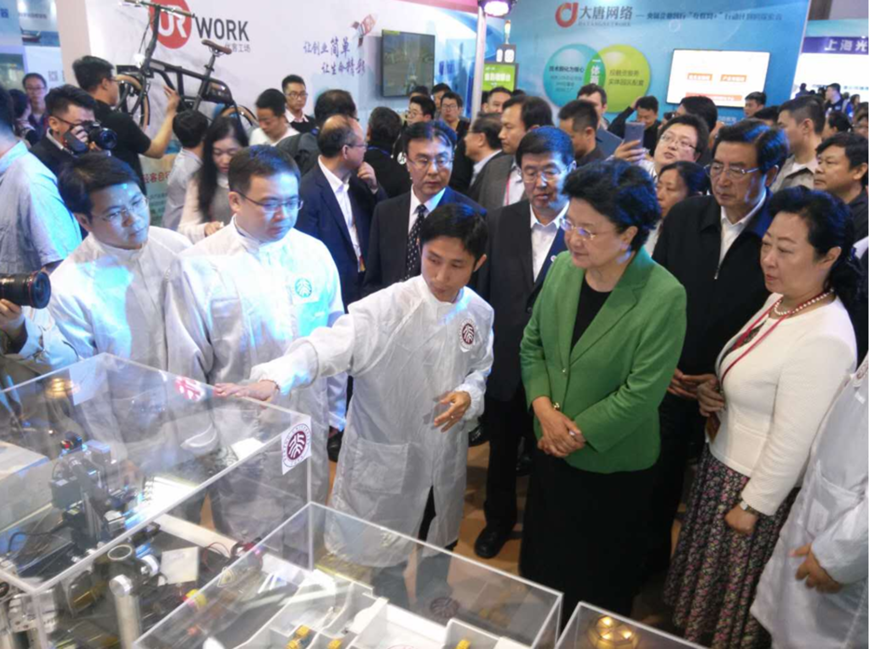2016年5月,北京大學(xué)核物理與核技術(shù)國(guó)家重點(diǎn)實(shí)驗(yàn)室(重離子物理研究所)的“激光粒子加速器與技術(shù)革命”項(xiàng)目參與了全國(guó)科技周展示,圖為顏學(xué)慶教授為劉延?xùn)|等領(lǐng)導(dǎo)同志匯報(bào)科研進(jìn)展