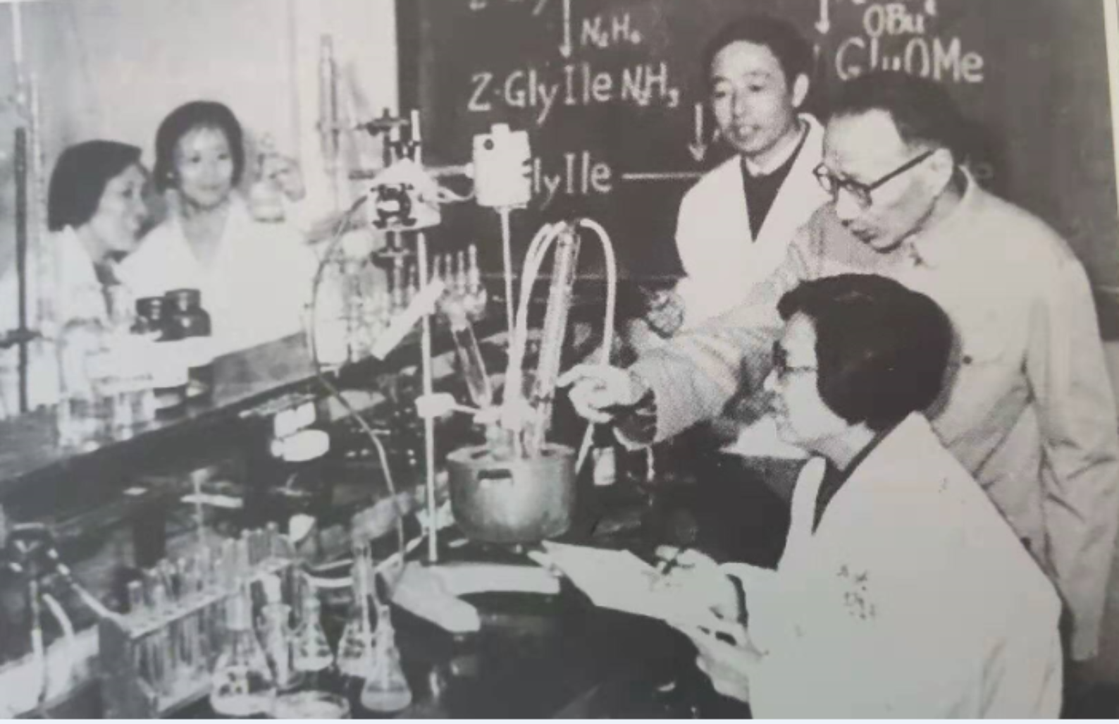 北大人在核工業(yè)領(lǐng)域大顯身手的同時(shí),在多肽化學(xué)的研究方面也取得了重大進(jìn)展。1964年,北京大學(xué)化學(xué)系與中國(guó)科學(xué)院有機(jī)化學(xué)研究所、生物化學(xué)研究所“兵團(tuán)作戰(zhàn)”,共同從事胰島素的合成工作。1965年,科學(xué)家們?cè)谑澜缟系谝淮斡萌斯し椒ê铣闪司哂信c天然分子相同化學(xué)結(jié)構(gòu)和完整生物活性的蛋白質(zhì)——結(jié)晶牛胰島素,標(biāo)志著人類在認(rèn)識(shí)生命、探索生命奧秘的征途中邁出了關(guān)鍵性的一步,開辟了人工合成蛋白質(zhì)的時(shí)代,在生命科學(xué)發(fā)展史上產(chǎn)生了重大的意義與影響。