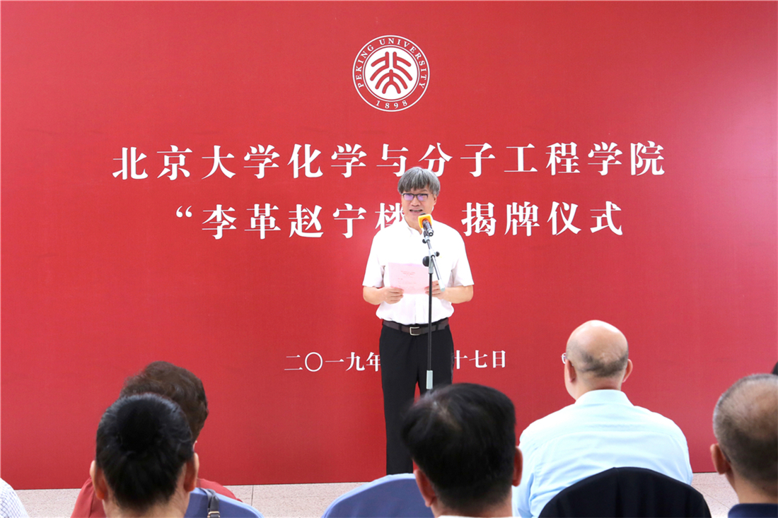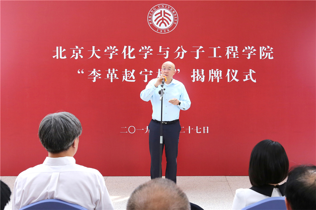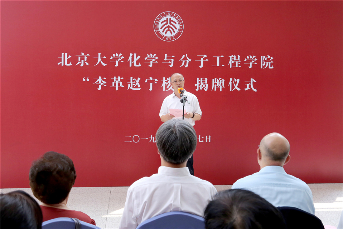2019年7月27日,北京大學(xué)化學(xué)學(xué)院A區(qū)科研大樓“李革趙寧樓”冠名揭牌儀式舉行。“北京大學(xué)李革趙寧教育基金”創(chuàng)立者、北京大學(xué)化學(xué)系1985級校友李革、趙寧伉儷,北京大學(xué)黨委常委、副校長王博,化學(xué)學(xué)院黨委書記馬玉國,副院長陳繼濤、呂明泉,北京大學(xué)教育基金會(美國)總裁趙琳出席揭牌儀式,儀式由陳繼濤主持。