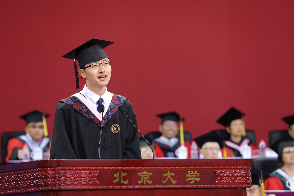 畢業(yè)生代表、元培學院2015級本科生張棟杰分享了從未名湖畔到天山腳下、從北大學生到鄉(xiāng)村教師的心路歷程。在青海格爾木參加愛心社的支教活動、在蔚秀園教老人使用智能手機、在國家會議中心做“一帶一路峰會”志愿者……在校的四年間,志愿服務成為他生活中必不可少的一部分。如今,他作為北京大學研究生支教團的一員,即將赴新疆水西溝鎮(zhèn)支教,去延續(xù)自己未竟的夢想。他說,北大賦予了自己尊嚴、學識和情懷,還有風雨中堅持奔跑的決心與力量,他愿以自己的微光照亮每一個孩子的內心,為教育扶貧貢獻自己的綿薄之力。“遠行的路上并不孤單,還有無數(shù)北大前輩與我們同向同行。”