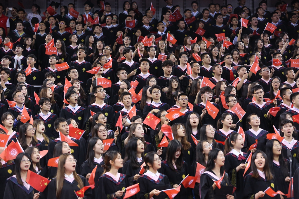 以院系為單位,郝平宣布授予2019屆本科畢業(yè)生學士學位并向他們表示祝賀。“萬卷詩書堪用世,一塔湖圖總故鄉(xiāng)”“學以致用,心系民生”“工道自然成,學為家國夢”“商學求道,光華惟新”“解析理想,求導人生”“健康所系,性命相托,北大醫(yī)學,濟世報國”……各具特色的院系口號響徹體育館上空,喊出了畢業(yè)生內心的宏大志愿和回報母校培養(yǎng)的莊嚴承諾。