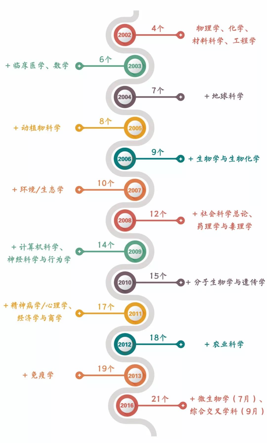 從2002年至2016年,北京大學(xué)入圍ESI前1%的學(xué)科從4個(gè)增加到21個(gè),保持至今。