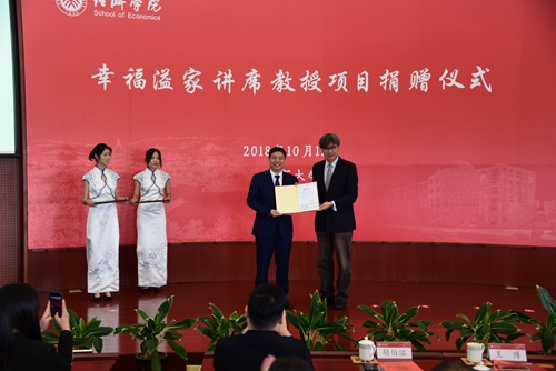 10月12日上午,北京大學(xué)經(jīng)濟(jì)學(xué)院“幸福溢家講席教授”項(xiàng)目捐贈(zèng)儀式在北大經(jīng)濟(jì)學(xué)院東旭學(xué)術(shù)報(bào)告廳舉行。該項(xiàng)目由中油溢家集團(tuán)董事長(zhǎng)、幸福溢家(北京)企業(yè)管理有限公司董事長(zhǎng)胡伯溢捐資2000萬(wàn)元人民幣設(shè)立,用于支持北大經(jīng)濟(jì)學(xué)院的師資隊(duì)伍建設(shè)。儀式由經(jīng)濟(jì)學(xué)院副院長(zhǎng)張亞光主持。
