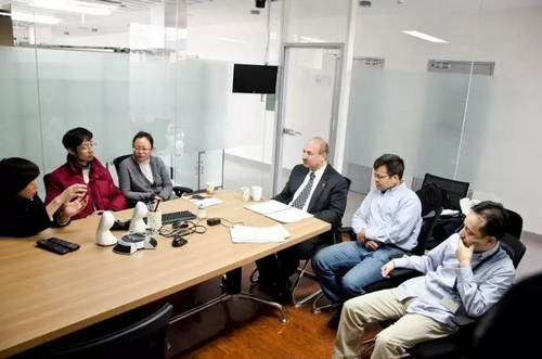 2013年9月26日,黃巖誼與Aaron Streets在實(shí)驗(yàn)室接待來(lái)訪的Lee Hood教授