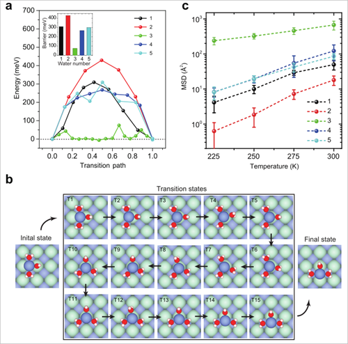 圖4 鈉離子水合物在NaCl表面輸運的幻數(shù)效應。a,第一性原理計算得到的不同離子水合物擴散的勢壘;b,第一性原理計算得到的含有三個水分子的鈉離子水合物的擴散過程;c,分子動力學模擬得到的不同離子水合物在225K-300K下1ns時間內擴散的均方位移。