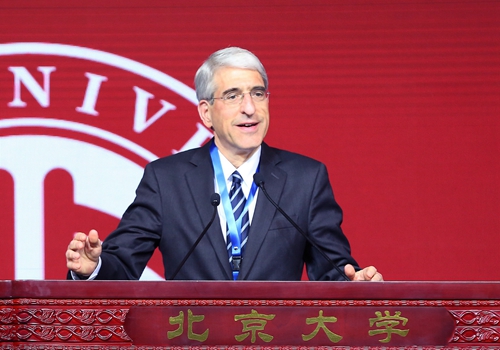 耶魯大學(xué)校長蘇必德(Peter Salovey)高度評(píng)價(jià)了北京大學(xué)在過去的兩個(gè)甲子中取得的成績,以及對(duì)中國和世界高等教育事業(yè)作出的巨大貢獻(xiàn)。他表示,耶魯大學(xué)和北大淵源頗深,北大原校長馬寅初曾在耶魯游學(xué)并取得學(xué)位,兩校有相似的歷史,在多個(gè)領(lǐng)域保持著密切的合作。耶魯和北大都致力于培養(yǎng)關(guān)注社會(huì)、解決全人類問題的未來領(lǐng)袖,他們將在解決全球性問題中發(fā)揮非常大的作用。他強(qiáng)調(diào),北京大學(xué)為人類福祉做出的努力有目共睹,相信北大人未來將在國際舞臺(tái)上承擔(dān)更重要的角色。