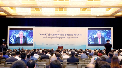 主旨發(fā)言開始前,聯(lián)合國秘書長安東尼奧·古特雷斯(Antonio Guterres)通過視頻方式發(fā)表了致辭。古特雷斯熱烈祝賀北京大學(xué)建校120周年,并非常贊賞“雙一流”建設(shè)國際研討會及國際學(xué)術(shù)界對聯(lián)合國工作的推進(jìn)。他表示,人類世界適逢非凡的發(fā)展機(jī)遇,謀求共同進(jìn)步,但同時(shí)也面臨諸多挑戰(zhàn)。古特雷斯希望與大家一同努力,實(shí)現(xiàn)全人類共享的和平與繁榮。