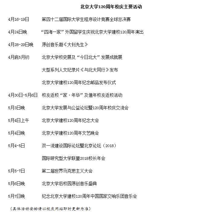 校慶期間,各院系等還將舉辦豐富多彩的活動(dòng),更多信息及參與方式將陸續(xù)發(fā)布。敬請關(guān)注北京大學(xué)、北京大學(xué)120周年校慶、北京大學(xué)校友工作辦公室官方微信、微博和網(wǎng)站。歡迎廣大師生校友聯(lián)系所在院系,參與校慶活動(dòng)。師生校友可聯(lián)系所在院系或校友辦、校慶籌委會(huì)秘書處獲得更多校慶信息。