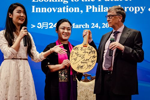 演講會上,七屆乒乓球世界冠軍得主、北京大學教授劉偉代表全體北大師生將一塊眾多中國乒乓球世界冠軍簽名的乒乓球拍贈予蓋茨