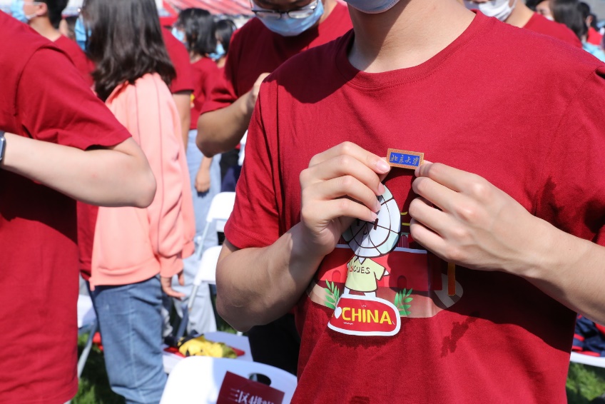 在老師們的見(jiàn)證下,新生全體起立,集體佩戴校徽。這枚校徽不只是北大人的身份標(biāo)識(shí),更是百余年來(lái)北大精神的凝結(jié)與延續(xù)。戴上校徽的那一刻,他們從此與這“永遠(yuǎn)的校園”真正血脈相連,“北京大學(xué)”四個(gè)字將成為他們一生的印記,也將見(jiàn)證新一代北大人在奮斗中融入時(shí)代洪流,攜手共進(jìn),共同譜寫(xiě)青春的華彩篇章。