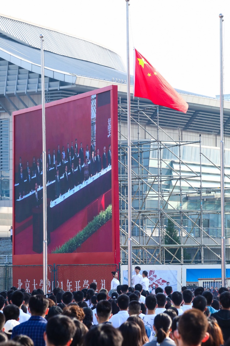 全體起立,奏唱國(guó)歌,升旗儀式結(jié)束后,北京大學(xué)2021年開(kāi)學(xué)典禮正式開(kāi)始。