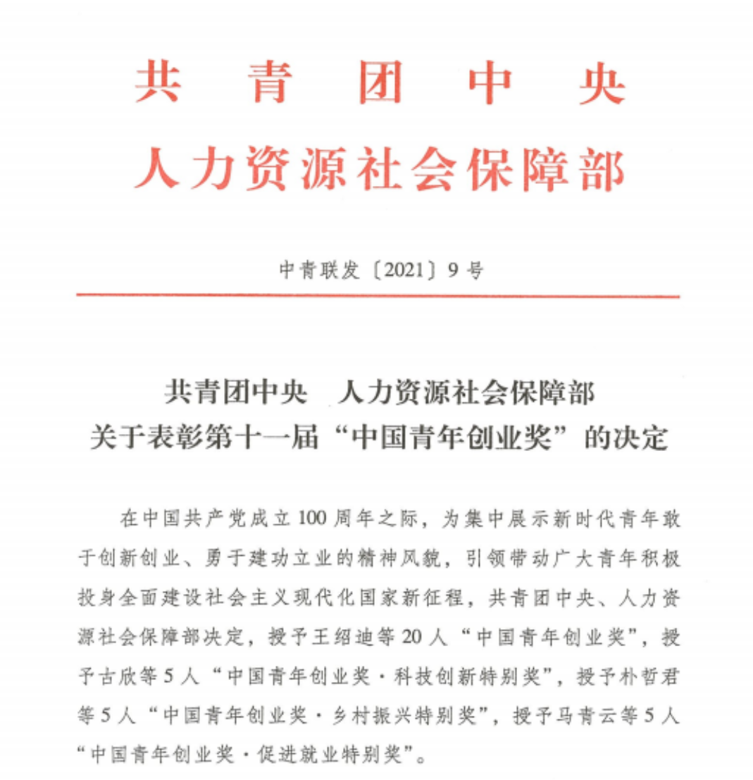 “中國青年創(chuàng)業(yè)獎”由共青團中央、人力資源社會保障部共同發(fā)起設立,表彰創(chuàng)業(yè)事跡突出、為經(jīng)濟社會發(fā)展做出重要貢獻的中國青年創(chuàng)業(yè)者。該獎項每兩年舉辦一屆,至今已連續(xù)舉辦11屆,對于引領青年創(chuàng)新創(chuàng)業(yè)具有鮮明的導向意義、示范意義。今年共評選產(chǎn)生第十一屆“中國青年創(chuàng)業(yè)獎”20名,“科技創(chuàng)新特別獎”“鄉(xiāng)村振興特別獎”“促進就業(yè)特別獎”各5名。本次評選,北大團委積極推薦創(chuàng)新創(chuàng)業(yè)領域優(yōu)秀校友及在校學生參評,經(jīng)過激烈競爭,王紹迪及李武松兩名校友斬獲“中國青年創(chuàng)業(yè)獎”,陳方平同學獲得“中國青年創(chuàng)業(yè)獎·科技創(chuàng)新特別獎”。