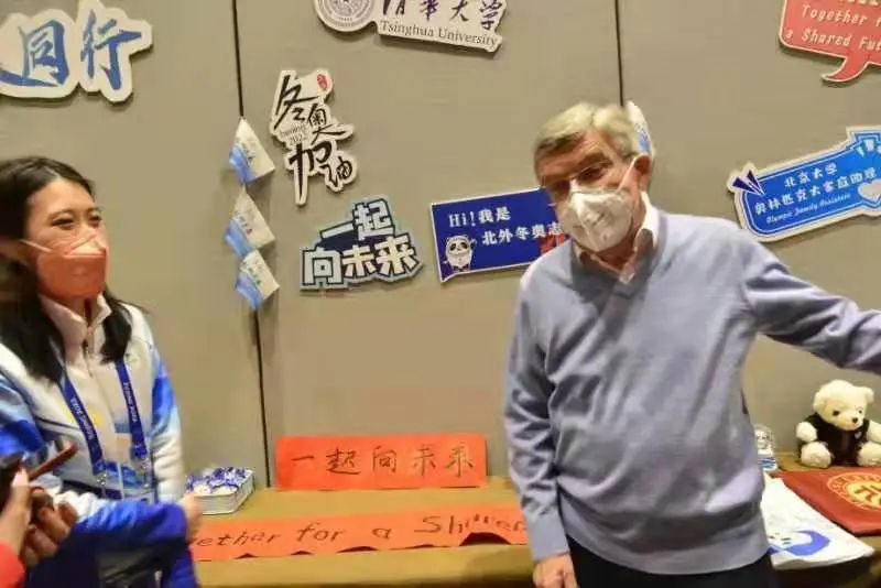 巴赫對北京大學奧林匹克大家庭助理志愿者們作出的貢獻表示感謝,為志愿者們送來了虎年的新春祝福,“像老虎一樣充滿斗志、充滿力量、充滿勇氣、充滿快樂。”北京大學冬奧志愿者、哲學系2020級碩士生屈文鑫帶領巴赫參觀了志愿者同學們書寫的春聯(lián),介紹了春聯(lián)的美好寓意,巴赫還跟她學習了“一起向未來”的中文發(fā)音。對此,巴赫說,“你們從事的工作值得自豪,也將從中深刻地體會到‘一起向未來’的意義。”