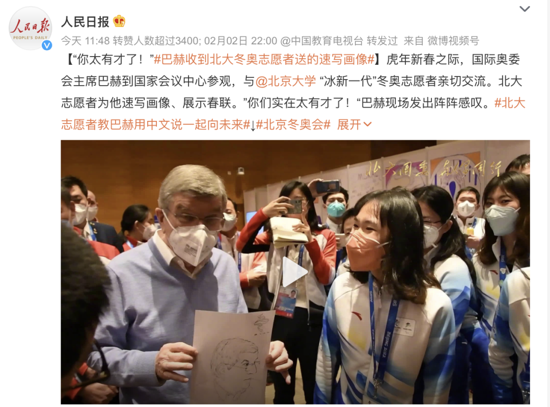 在演講結束后,北京大學冬奧志愿者、心理與認知科學學院2021級博士生周娜為巴赫送上為其現(xiàn)場創(chuàng)作的人物肖像速寫。巴赫表示感謝,稱贊周娜很有天賦。在了解到周娜的專業(yè)是心理學后,巴赫說道心理學就是需要懂得去鼓勵他人,給人陽光與溫暖。