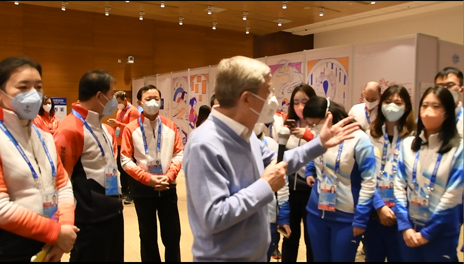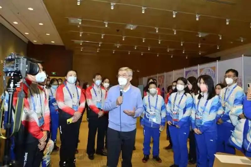 在北京2022年冬奧會即將開幕之際,1月30日中午,國際奧委會主席巴赫前往國家會議中心OFA(奧林匹克大家庭助理)辦公室參觀交流。