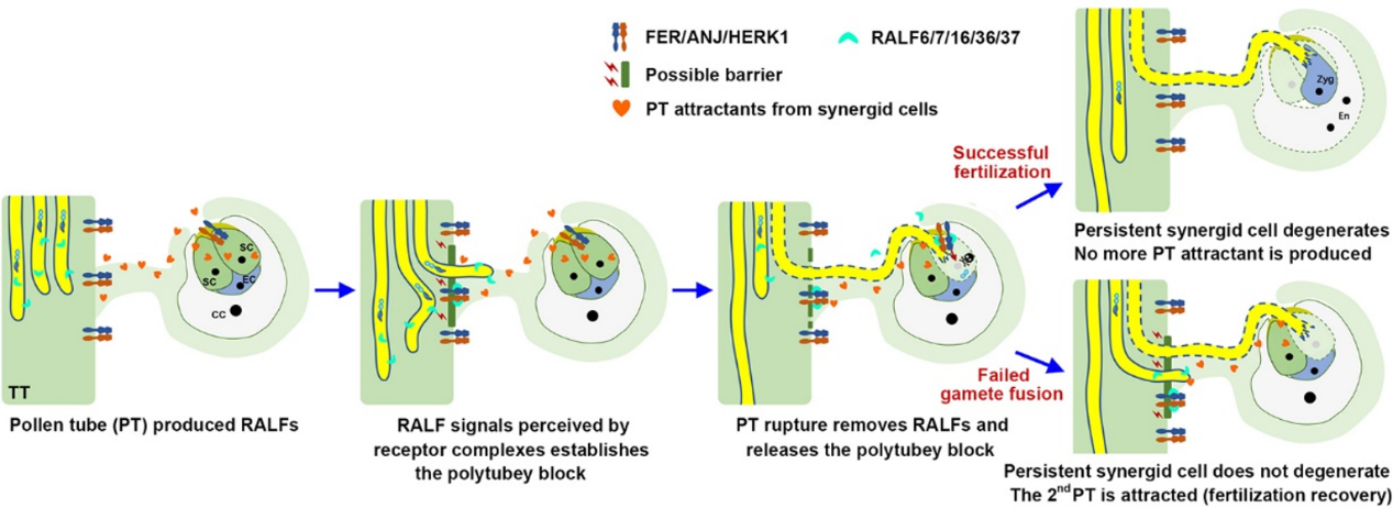 1、花粉管分泌RALF小肽。2、隔膜處的受體復(fù)合體接受RALF信號(hào),建立防止多花粉管穿出的屏障。3、花粉管爆裂后RALF急劇減少,隔膜處的屏障解除。4、受精成功后,宿存助細(xì)胞降解,吸引物質(zhì)失活、減少。5、配子融合失敗后,胚珠吸引第二根花粉管進(jìn)行受精補(bǔ)償。Cc,中央細(xì)胞;Ec,卵細(xì)胞;Sc,助細(xì)胞;En,胚乳核;Zyg,合子