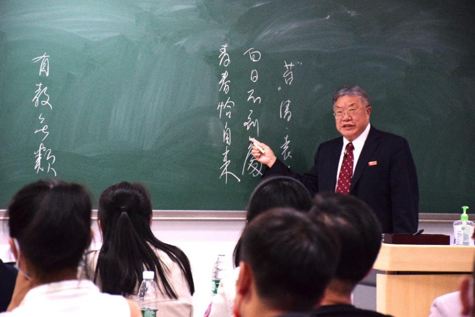 開學(xué)典禮結(jié)束后,中國語言文學(xué)系程郁綴教授引用清代詩人袁枚的詩歌《苔》,拉開平民學(xué)校第一課《古典詩歌與人文精神》的序幕。他以“苔花如米小,也學(xué)牡丹開”勉勵北大平民學(xué)校學(xué)員努力學(xué)習(xí),綻放生命光彩。今年是程郁綴第十次參與平民學(xué)校課程教學(xué)。在本次課程中,他為學(xué)員們講解了《詩經(jīng)》《楚辭》《觀滄海》《茅屋為秋風(fēng)所破歌》和《游子吟》等古詩文作品,亦莊亦諧、深入淺出的講解讓學(xué)員們受益匪淺,教室里不時發(fā)出陣陣笑聲。