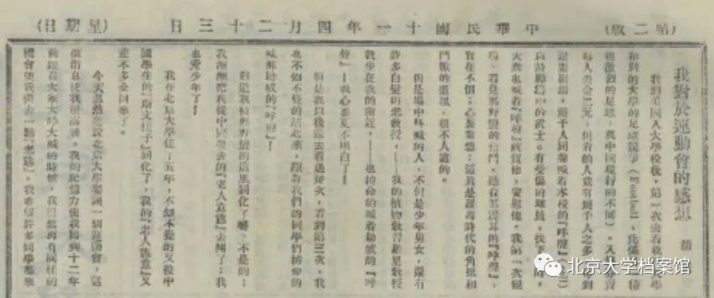 1922年4月23日《北京大學(xué)日刊》刊發(fā)胡適《我對于運動會的感想》一文