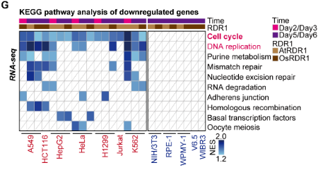 在接下來的研究中,令作者驚訝和意外的是,AtRDR1和OsRDR1能夠在體外顯著抑制所有10種癌癥細(xì)胞系的增殖,但對(duì)其他5種非癌細(xì)胞沒有影響。RDR1還可以顯著抑制癌細(xì)胞的克隆形成能力。在分子水平上,基于RNA-seq的基因集富集分析(GSEA)表明,AtRDR1和OsRDR1可以干擾所有癌癥細(xì)胞系中的細(xì)胞周期過程,但在非癌對(duì)照細(xì)胞中沒有明顯作用。