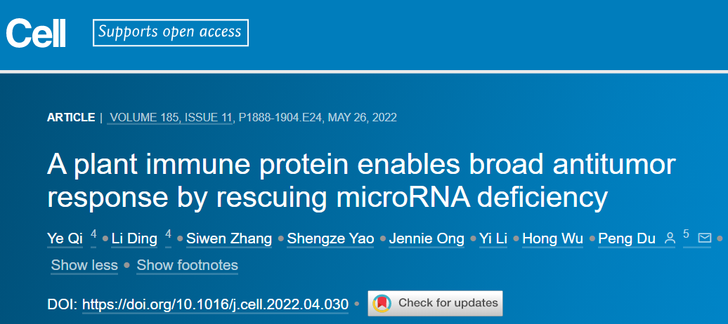 2022年5月26日,北京大學(xué)杜鵬課題組在Cell雜志在線發(fā)表了題為“A plant immune protein enables broad antitumor response by rescuing microRNA deficiency” 的研究論文。該研究發(fā)現(xiàn):