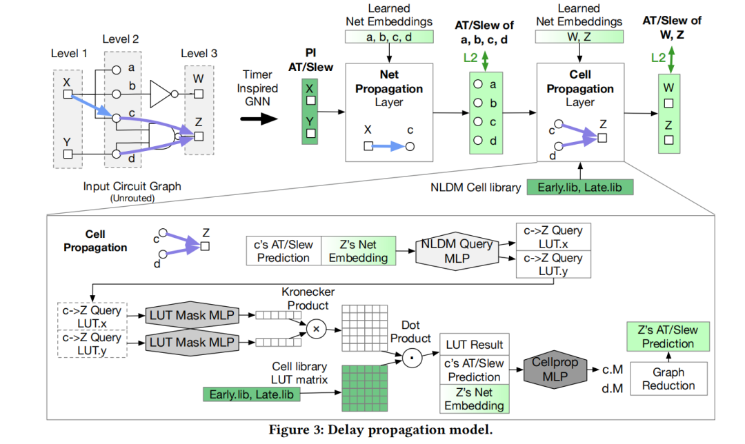 除了芯片靜態(tài)時(shí)序分析領(lǐng)域,他還積極探索EDA和人工智能的交叉方向。在研究中,他將圖神經(jīng)網(wǎng)絡(luò)和時(shí)序分析引擎相結(jié)合,提出跨越芯片設(shè)計(jì)流程多個(gè)環(huán)節(jié)的建模技術(shù),定制圖學(xué)習(xí)方法模擬時(shí)序分析的解析過程。同時(shí)他還探索將時(shí)序分析過程與神經(jīng)網(wǎng)絡(luò)訓(xùn)練進(jìn)行類比,提出了學(xué)術(shù)界首個(gè)基于可微時(shí)序引擎的布局優(yōu)化算法,較當(dāng)前最先進(jìn)的布局算法性能提升28%以上。