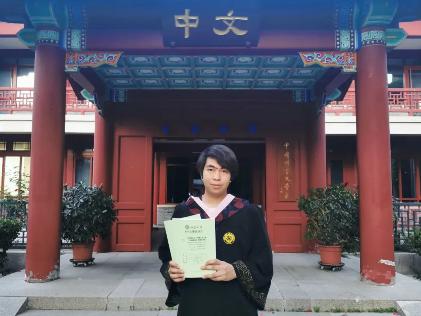 陳志軒手持畢業(yè)論文在中文系門(mén)前留影