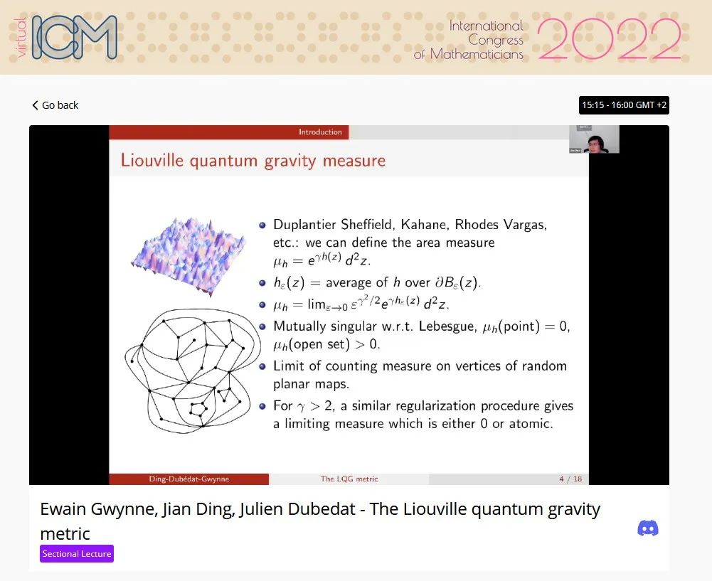 丁劍老師在本次國際數(shù)學(xué)家大會(huì)上作了題為“The Liouville quantum gravity metric”報(bào)告。丁劍、Julien Dubedat,、Ewain Gwynne共同受邀完成了本次ICM報(bào)告。報(bào)告最先由丁劍簡要介紹LQG。特別地,在γ=√8/3的情形,LQG曲面與Brownian map[2] 被Miller與Sheffield證明是等價(jià)的。丁劍接下來介紹了LQG曲面的Hausdorff維數(shù), 在他與Gwynne,以及與Zeitouni、北大數(shù)院章復(fù)熹的文章中證明了維數(shù)的存在性,及其關(guān)于γ嚴(yán)格遞增等若干良好性質(zhì)。在這一系列工作中我們得到了關(guān)于維數(shù)相對較好的上下界,然而迄今為止所有關(guān)于維數(shù)具體表達(dá)式的猜想都被證明不成立。Watabiki的猜測被人們相信了許多年,然而丁劍與Goswami證明其至少在維數(shù)較低時(shí)是不成立的。丁劍與章復(fù)熹的文章中也指出了LQG的維數(shù)在更廣泛的log-correlated fields大類中并不具備普適性。
