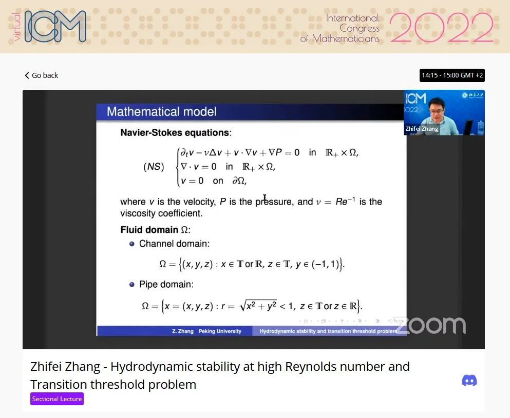 章志飛老師在本次國際數(shù)學(xué)家大會(huì)上作了題為 “Hydrodynamic stability at high Reynolds number and Transition threshold problem”報(bào)告。流動(dòng)穩(wěn)定性的研究始于1883年著名的雷諾管道流體實(shí)驗(yàn)。高雷諾數(shù)下的流動(dòng)穩(wěn)定性一直是流體力學(xué)研究中的基本問題。章志飛教授的報(bào)告主要介紹他和合作者在流動(dòng)穩(wěn)定性的數(shù)學(xué)理論方面所解決的一系列重要的公開問題,如:剪切流的線性無粘阻尼、Kolmogorov流的最優(yōu)增強(qiáng)耗猜測。報(bào)告特別從數(shù)學(xué)理論上探究了層流到湍流轉(zhuǎn)捩的機(jī)制,概述了解決三維Couette流轉(zhuǎn)捩閾值猜測的關(guān)鍵要素。