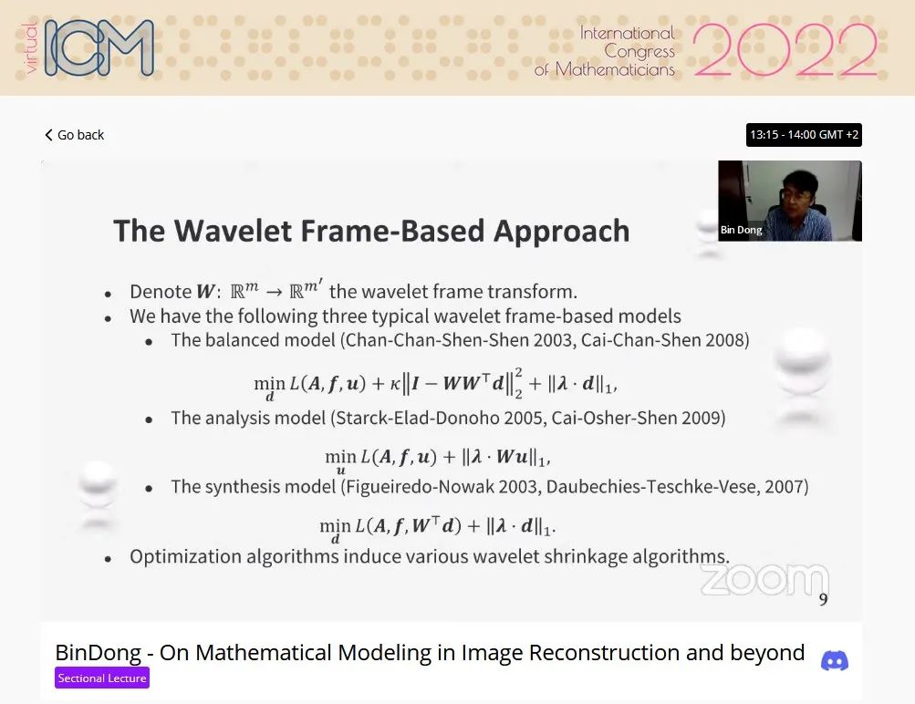董彬老師在本次國際數(shù)學(xué)家大會(huì)上作了題為“On Mathematical Modeling in Image Reconstruction and beyond”報(bào)告。在本次報(bào)告中,董彬首先簡要介紹基于圖像的科學(xué)發(fā)現(xiàn)和計(jì)算成像的概念。報(bào)告從一個(gè)生動(dòng)的例子“運(yùn)動(dòng)中的馬”出發(fā),說明了科學(xué)發(fā)現(xiàn)在很大程度上依賴于視覺檢驗(yàn),而圖像是必不可少的工具。董彬回顧兩種流行的圖像重建方法,即基于偏微分方程和基于小波框架的方法。一個(gè)關(guān)鍵的觀察是小波函數(shù)的消失矩與微分算子的階之間存在一定的對應(yīng)關(guān)系,基于該觀察,董彬?qū)⒆兎帜P团c小波框架的分析模型搭建了橋梁,并推導(dǎo)出了新的小波收縮算法和PDE模型。該系列工作也啟發(fā)了董彬后續(xù)在深度學(xué)習(xí)中的研究,建立了深度神經(jīng)網(wǎng)絡(luò)和離散微分方程的聯(lián)系,并由此誘導(dǎo)了新的網(wǎng)絡(luò)構(gòu)架,這些研究也逐漸發(fā)展出了一種機(jī)理與數(shù)據(jù)融合的算法設(shè)計(jì)模式,并應(yīng)用于科學(xué)計(jì)算中的許多其他問題。