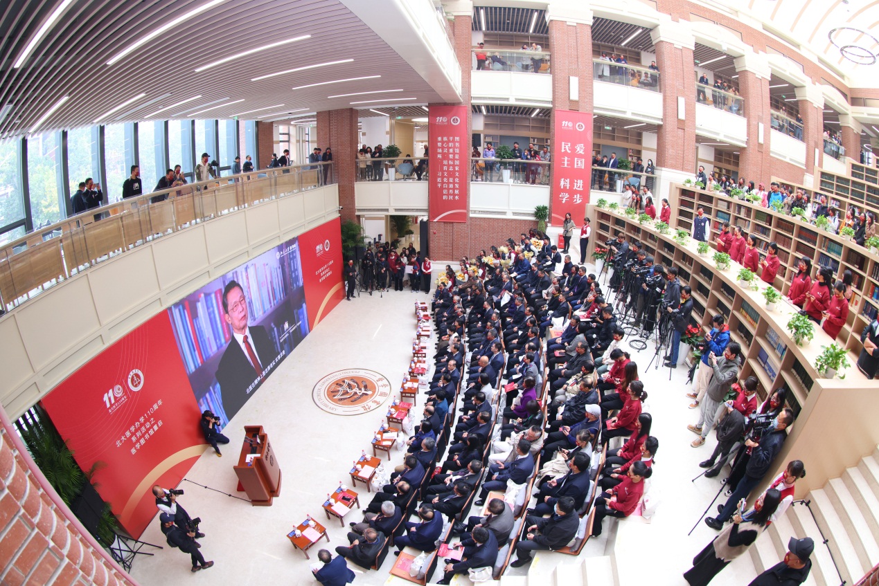 以史為鑒,回顧忖思百十年不凡春秋。踔厲奮發(fā),篤行不怠新時代奮進(jìn)征程。“1912年北大醫(yī)學(xué)文明的火種在此萌發(fā),1922年第一所西醫(yī)學(xué)校圖書館在北醫(yī)誕生,跨越一個世紀(jì),我們無比自豪地見證曾經(jīng)斑駁的墻面磚瓦變成了眼前這座恢弘嶄新的圖書館大樓,成為北大醫(yī)學(xué)新的精神地標(biāo)。”喬杰在致辭中表示,新的圖書館會成為大家碰撞火花、思想創(chuàng)新的源頭活水,在閱讀中積淀知識、在交流中推動創(chuàng)新,以“愛國、進(jìn)步、民主、科學(xué)”精神為指引,堅持“勤奮、嚴(yán)謹(jǐn)、求實、創(chuàng)新”學(xué)風(fēng),明德厚道、尚仁出新,為黨育人、為國育才,堅定不移推進(jìn)高質(zhì)量發(fā)展,為健康中國建設(shè)和國家繁榮昌盛貢獻(xiàn)北大醫(yī)學(xué)人的全部力量!