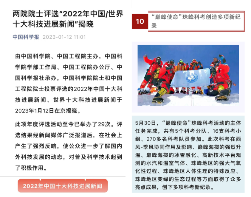 由中國(guó)科學(xué)院、中國(guó)工程院主辦,中國(guó)科學(xué)院學(xué)部工作局、中國(guó)工程院辦公廳、中國(guó)科學(xué)報(bào)社承辦,中國(guó)科學(xué)院院士和中國(guó)工程院院士投票評(píng)選的2022年中國(guó)十大科技進(jìn)展新聞、世界十大科技進(jìn)展新聞?dòng)?023年1月12日在京揭曉。其中,“巔峰使命”珠峰科考創(chuàng)造多項(xiàng)新紀(jì)錄入選“2022年中國(guó)十大科技進(jìn)展新聞”。