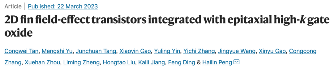 近年來,我國“芯片荒”這一“老大難”問題屢屢成為焦點(diǎn)。為了讓“卡脖子”的手松一點(diǎn),北大人一直在這條荊棘叢生的道路上砥礪前行,力求為我國集成電路技術(shù)的迭代升級事業(yè)添磚加瓦。2023年3月22日,彭海琳課題組在Nature在線發(fā)表題為《外延高κ柵氧化物集成型二維鰭式晶體管》(“2D fin field-effect transistors integrated with epitaxial high-κgate oxide”)的研究論文。這一研究報道了世界首例二維半導(dǎo)體鰭片/高κ柵氧化物異質(zhì)結(jié)陣列的外延生長及其三維架構(gòu)的集成制備,并研制了高性能二維鰭式場效應(yīng)晶體管(2D FinFET)。