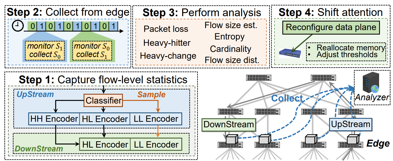 數(shù)據(jù)平面網(wǎng)絡遙測系統(tǒng)通常將網(wǎng)絡流劃分為多個窗口分別統(tǒng)計各窗口的流級信息,然而受限于可編程交換機的資源限制,現(xiàn)有工作只支持固定窗口大小的滾動窗口。論文“OmniWindow: A General and Efficient Window Mechanism Framework for Network Telemetry”提出了一個通用且高效的窗口機制框架OmniWindow,在數(shù)據(jù)面將原始窗口拆分為細粒度的子窗口進行測量,在控制面合并子窗口的測量結果,從而實現(xiàn)任意類型、大小的窗口機制。該框架設計子窗口的數(shù)據(jù)平面內存布局、同步方法以及高速狀態(tài)收集重置方案,解決了子窗口機制引入的資源開銷、一致性和切換開銷問題。該框架與1個意圖遙測系統(tǒng)和8種sketch遙測算法相結合,相比傳統(tǒng)窗口機制提升了14.3%的測量精度。該論文第一作者為計算機學院2021級博士生孫海鋒(導師黃群助理教授),作者包括黃群、李佳衡、賀錦濤和桂杰等。