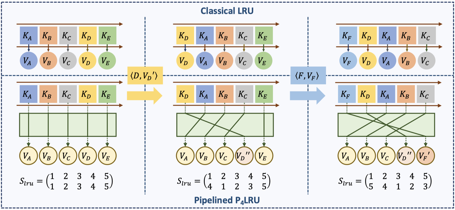 數(shù)據(jù)面緩存是網(wǎng)絡設備,如可編程交換機、智能網(wǎng)卡、DPU等的重要功能。然而,受限于數(shù)據(jù)面編程模型和內存訪問模型,目前的數(shù)據(jù)面緩存常常采用簡單但效率不高的緩存替換策略。因此,“P4LRU: Towards An LRU Cache Entirely in Programmable Data Plane”這篇論文致力于在數(shù)據(jù)面實現(xiàn)LRU,這是一種近似最優(yōu)的緩存替換策略。論文分析了為何多種典型的LRU實現(xiàn)無法在當前的可編程數(shù)據(jù)面部署,并提出了P4LRU,一種專門為流水線模型設計的LRU實現(xiàn)方案。P4LRU將被緩存的鍵和值分別存儲,并利用一個被稱為緩存狀態(tài)的自動機來描述鍵和值的實時映射關系,從而只需對每個數(shù)據(jù)執(zhí)行單次內存訪問。P4LRU通過將自動機的狀態(tài)和轉移邏輯編碼到整數(shù)邏輯運算單元,在受限的數(shù)據(jù)面編程模型下實現(xiàn)了自動機的存儲和實時轉移。論文以P4LRU緩存單元為基礎,設計了多種網(wǎng)絡系統(tǒng),包括網(wǎng)絡地址轉換系統(tǒng)、數(shù)據(jù)庫查詢加速系統(tǒng)和大規(guī)模網(wǎng)絡測量系統(tǒng),并在Tofino可編程交換機上完全實現(xiàn)了這些系統(tǒng)。該論文第一作者為計算機學院2020級博士生趙義凱(導師楊仝),作者包括楊仝、劉文睿和董豐豪等。