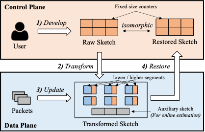Sketch因在有限空間中實現(xiàn)高精度查詢的特性被廣泛用于網(wǎng)絡測量。隨著測量業(yè)務流量不斷增加、任務趨于多樣化,有限的片上內存成為了sketch部署的瓶頸。已有的內存優(yōu)化方案均有嚴重的精度丟失或者特定的適用范圍,因而難以使用。論文“BitSense: Universal and Nearly Zero-Error Optimization for Sketch Counters with Compressive Sensing”提出了一個針對sketch計數(shù)器的幾乎零誤差的且通用的內存優(yōu)化框架BitSense。為了實現(xiàn)幾乎零誤差, BitSense利用計數(shù)器值通常向零偏斜的特性,將計數(shù)器的高位視為稀疏向量并使用壓縮感知技術對其進行壓縮與還原;它還帶有自動化的參數(shù)配置,并且在理論上證明了幾乎零誤差的性質。為了通用性,BitSense提供了一套編程接口,使用戶能像實現(xiàn)普通sketch那樣快捷開發(fā)內存優(yōu)化的sketch,并對壓縮與還原無感知。BitSense已經(jīng)與14種現(xiàn)有的測量系統(tǒng)結合。基于Tofino交換機和軟件仿真的實驗表明BitSense能在引入極小的訪存和計算開銷下壓縮25%~80%的內存而幾乎不丟失精度,超越了此前5種代表性的內存優(yōu)化框架。該論文第一作者為計算機學院2022級博士生丁睿(導師黃群),作者包括黃群、楊仕博和訪問學生陳翔等。