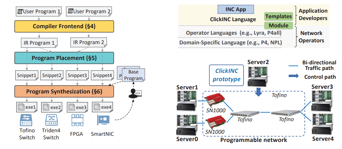 在網(wǎng)計算技術可以有效加速分布式系統(tǒng)的速度并減少其成本。但是,在異構數(shù)據(jù)中心中存在差異化的設備與應用和多徑的網(wǎng)絡拓撲,這導致應用開發(fā)者難以在不觸及已有的網(wǎng)絡功能的前提下開發(fā)在網(wǎng)計算應用,并有效利用設備資源。“ClickINC: In-network Computing as a Service in Heterogeneous Programmable Data-center Networks”設計了ClickINC框架,支持異構數(shù)據(jù)中心中的在網(wǎng)計算應用開發(fā)。ClickINC為開發(fā)者提供高級、模塊化編程語言,并將用戶程序編譯到分布式的異構設備上;在此過程中,ClickINC在全網(wǎng)范圍內合理分布程序片段,提升資源利用率;同時,ClickINC支持用戶在運行時增量的添加和刪除程序。研究團隊開發(fā)ClickINC原型,并通過實驗證明該系統(tǒng)的可行性、編程友好性和資源利用高效性。該論文第一作者為清華大學徐文佺,通訊作者為北京大學吳文斐助理教授、清華大學劉斌和上海大學紐約分校劉古月。