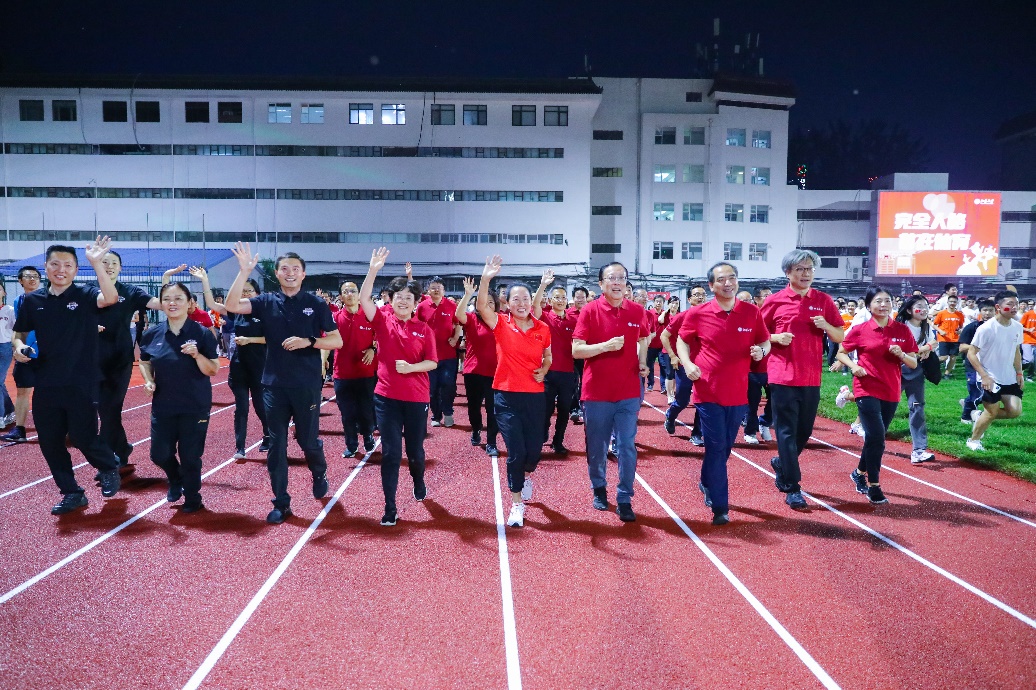 現(xiàn)場(chǎng)師生在體育教研部教師的帶領(lǐng)下開(kāi)展豐富多彩的熱身活動(dòng)。熱身活動(dòng)不僅幫助同學(xué)們伸展肢體,以更好的狀態(tài)投入之后的運(yùn)動(dòng),還讓大家在合作互動(dòng)中拉近了距離、增進(jìn)了友誼。動(dòng)感的音樂(lè)聲、炫目的燈光以及同學(xué)們的歡笑聲、歡呼聲交織在體育場(chǎng)上空,激蕩著朝氣蓬勃的青春活力。