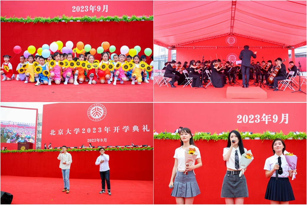 典禮開始前的暖場節(jié)目讓五四體育場的氣氛熱烈而充滿溫馨。舞蹈《孩子的天空》,交響樂《卡門組曲·波西米亞舞曲》,歌曲聯(lián)唱《聽》《難以抗拒你容顏》《起風(fēng)了》……北大附屬幼兒園的孩子們、學(xué)生交響樂團(tuán)的同學(xué)們以及校園優(yōu)秀學(xué)生歌手,為大家?guī)盹L(fēng)格各異而精彩紛呈的演出,贏得陣陣掌聲。屏幕上播放的開場視頻,回顧了從新生報(bào)到、軍訓(xùn)到新生教育每個(gè)環(huán)節(jié)的難忘瞬間。視頻里新生們表達(dá)著對新生活的憧憬,引來典禮現(xiàn)場同學(xué)們陣陣歡呼和笑聲。