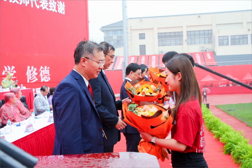 在第39個(gè)教師節(jié)即將到來之際,新生代表步入主席臺,將手中鮮花送給教師代表們,向辛勤育人的老師們表達(dá)感激之情和深深敬意。