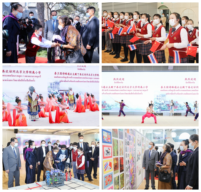 詩(shī)琳通公主一行來(lái)到北京大學(xué)附屬小學(xué),熱情活潑的附小同學(xué)們揮舞著中泰兩國(guó)國(guó)旗,在泡泡館前列隊(duì)歡迎,并向公主獻(xiàn)上鮮花。來(lái)自附小合唱團(tuán)、京劇團(tuán)、武術(shù)社團(tuán)、機(jī)器人社團(tuán)的孩子們?yōu)楣鲙?lái)了精彩紛呈的表演。公主一行還觀(guān)賞了附小學(xué)生的書(shū)畫(huà)作品展,附小校長(zhǎng)尹超、黨委書(shū)記王添淼作介紹。