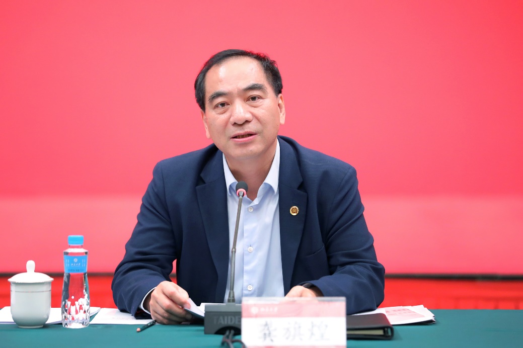龔旗煌全面總結(jié)了十年來北京大學(xué)貫徹落實(shí)習(xí)近平總書記重要講話精神,在立德樹人、辦學(xué)治校中取得的突出成績(jī)。新時(shí)代以來,在習(xí)近平總書記重要講話精神指引下,北大深入踐行“扎根中國(guó)大地辦大學(xué)”的指導(dǎo)思想,堅(jiān)持以“三項(xiàng)基礎(chǔ)性工作”為主線深化綜合改革,在整體上進(jìn)入了世界一流大學(xué)行列:一是以新思想培養(yǎng)時(shí)代新人,走好高水平人才自主培養(yǎng)之路;二是以新機(jī)制為國(guó)引才聚才,打造領(lǐng)軍人才薈萃的新高地;三是以新模式服務(wù)國(guó)家戰(zhàn)略,推動(dòng)更多創(chuàng)新成果在祖國(guó)大地上涌現(xiàn);四是以新格局強(qiáng)化內(nèi)驅(qū)動(dòng)能,構(gòu)建推動(dòng)學(xué)科高質(zhì)量發(fā)展的優(yōu)質(zhì)生態(tài);五是以新?lián)?dāng)推進(jìn)內(nèi)涵發(fā)展,提升師生的幸福感、獲得感。新時(shí)代新征程上,北大將堅(jiān)持以習(xí)近平新時(shí)代中國(guó)特色社會(huì)主義思想為指引,扎根中國(guó)大地辦大學(xué),為我國(guó)早日建成教育、科技、人才強(qiáng)國(guó),作出新的更大貢獻(xiàn)。