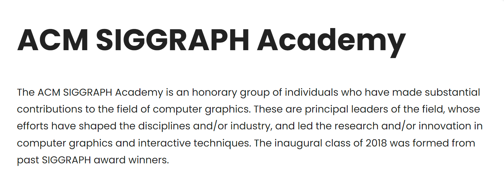 首屆ACM SIGGRAPH Academy入選的會(huì)員為該會(huì)議歷史上終身成就獎(jiǎng)和杰出貢獻(xiàn)獎(jiǎng)獲得者,此后每年通過推薦、評(píng)選產(chǎn)生,歷史累計(jì)入選者共計(jì)92人。據(jù)ACM官網(wǎng)介紹,入選學(xué)院的標(biāo)準(zhǔn)包括:對(duì)計(jì)算機(jī)圖形學(xué)和交互技術(shù)領(lǐng)域研究作出突出貢獻(xiàn);開創(chuàng)新的研究方向或?qū)ρ芯款I(lǐng)域產(chǎn)生卓越影響;代表性/具有啟發(fā)性的研究工作;積極參與社區(qū)活動(dòng)當(dāng)然,除了技術(shù)創(chuàng)新外,能夠入選Academy的也有藝術(shù)、教育、服務(wù)以及技術(shù)實(shí)踐等方面的杰出貢獻(xiàn)者。
