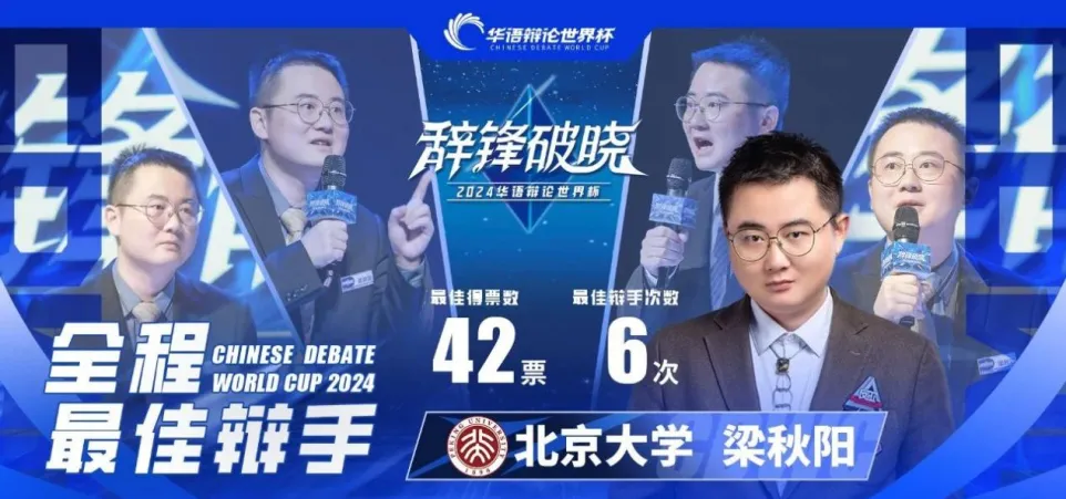 同時,我校心理與認(rèn)知科學(xué)學(xué)院2023級碩士梁秋陽斬獲全程最佳辯手,北大辯協(xié)教練、元培學(xué)院2006級校友胡開明榮獲最佳教練稱號。