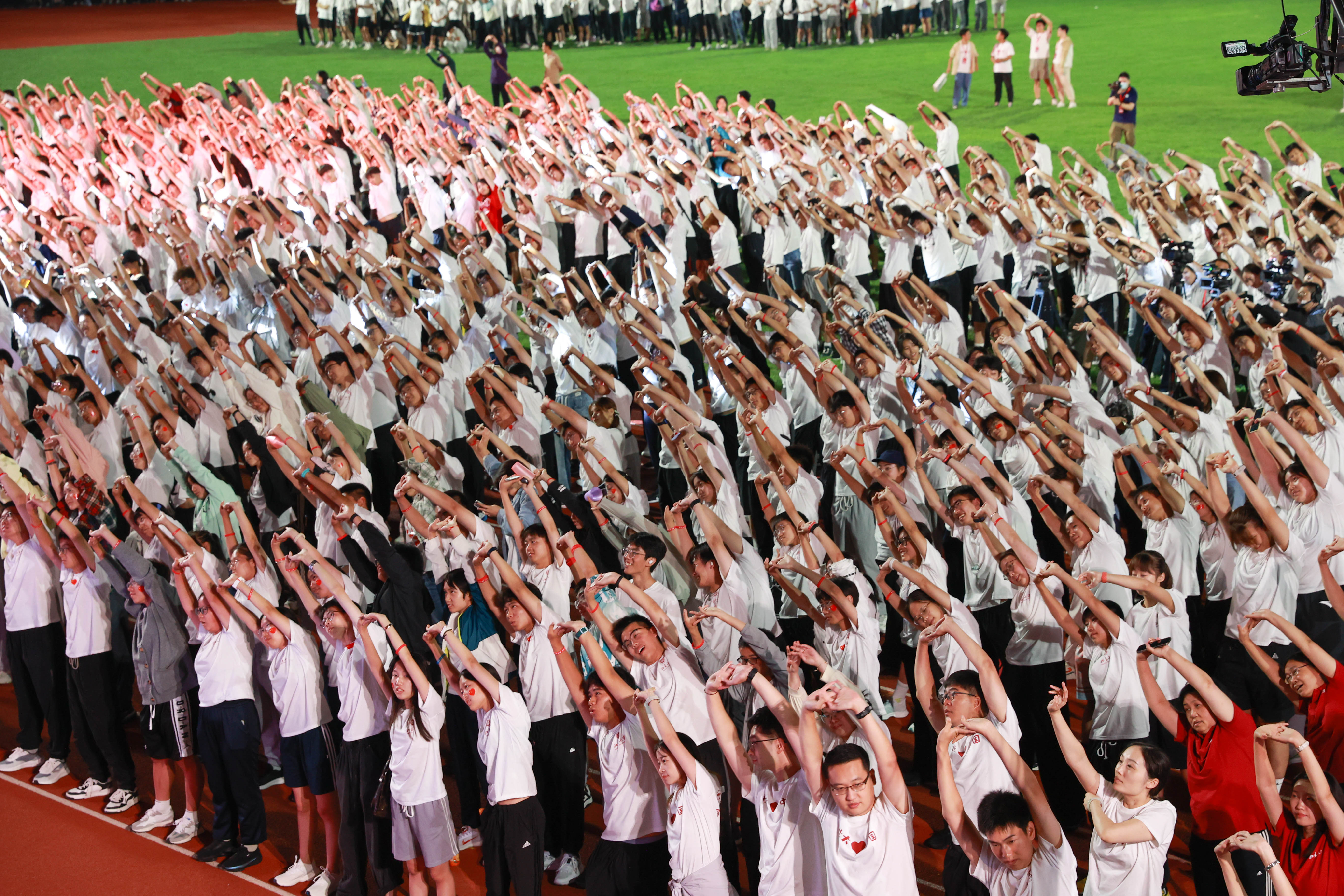 與此同時,身著彩色運動衫的新生輔導(dǎo)員在五四體育場中央排出了“2024”的圖案。“2024”圖案上方是一面巨幅五星紅旗——北大人用實際行動踐行著“完全人格,首在體育”的精神,更將動人的青春旋律融入祖國與時代的和聲之中。現(xiàn)場師生在奧運健兒帶領(lǐng)下,合唱《我和我的祖國》,獻(xiàn)禮中華人民共和國75周年華誕。