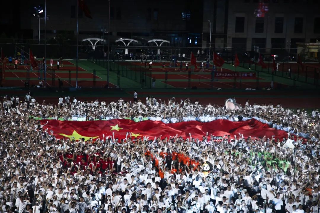 活動最后,現(xiàn)場師生于體育場中央集合,圍繞著五星紅旗與“2024”圖案合唱《燕園情》,高高舉起的閃光燈匯成一片璀璨的海洋。歌聲承載起一代代北大人的家國情懷與使命擔(dān)當(dāng)。高擎國旗,向陽生長,同學(xué)們心懷遠(yuǎn)大理想,勇攀高峰;扎根大地,向前奮進(jìn),北大青年錨定正確方向,知行合一。在“強(qiáng)國有我,青春有為”的口號聲中,北京大學(xué)2024年“開學(xué)第一跑”活動圓滿結(jié)束,現(xiàn)場師生心潮澎湃、豪情滿懷。