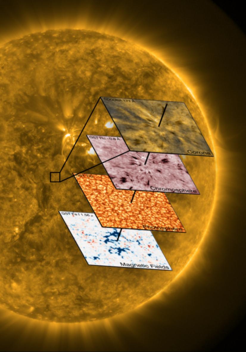 太陽針狀物的產(chǎn)生與加熱。背景為日冕極紫外圖像,層疊圖從下到上分別是黑色方框內(nèi)的光球縱向磁場(chǎng)、光球輻射、色球輻射和日冕輻射圖(Science, 366, 890, 2019)