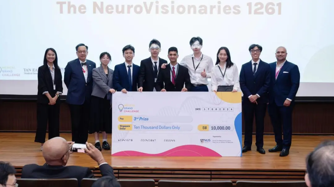 △決賽頒獎(jiǎng)儀式,左一:Lee Yinn Yi,MGC聯(lián)合主席 左二:Chong Yap Seng教授,新加坡國立大學(xué)醫(yī)學(xué)院院長,右三至右八:The Neurovisionaries團(tuán)隊(duì)成員 右二:Wang Weihan, MGC聯(lián)合主席 右一:Dinesh Visva Gunasekeran教授,MGC學(xué)術(shù)負(fù)責(zé)人