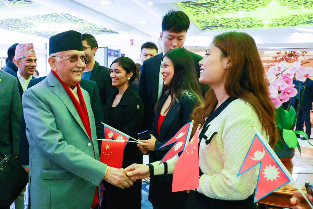 奧利與參與歡迎儀式的尼泊爾學(xué)子握手