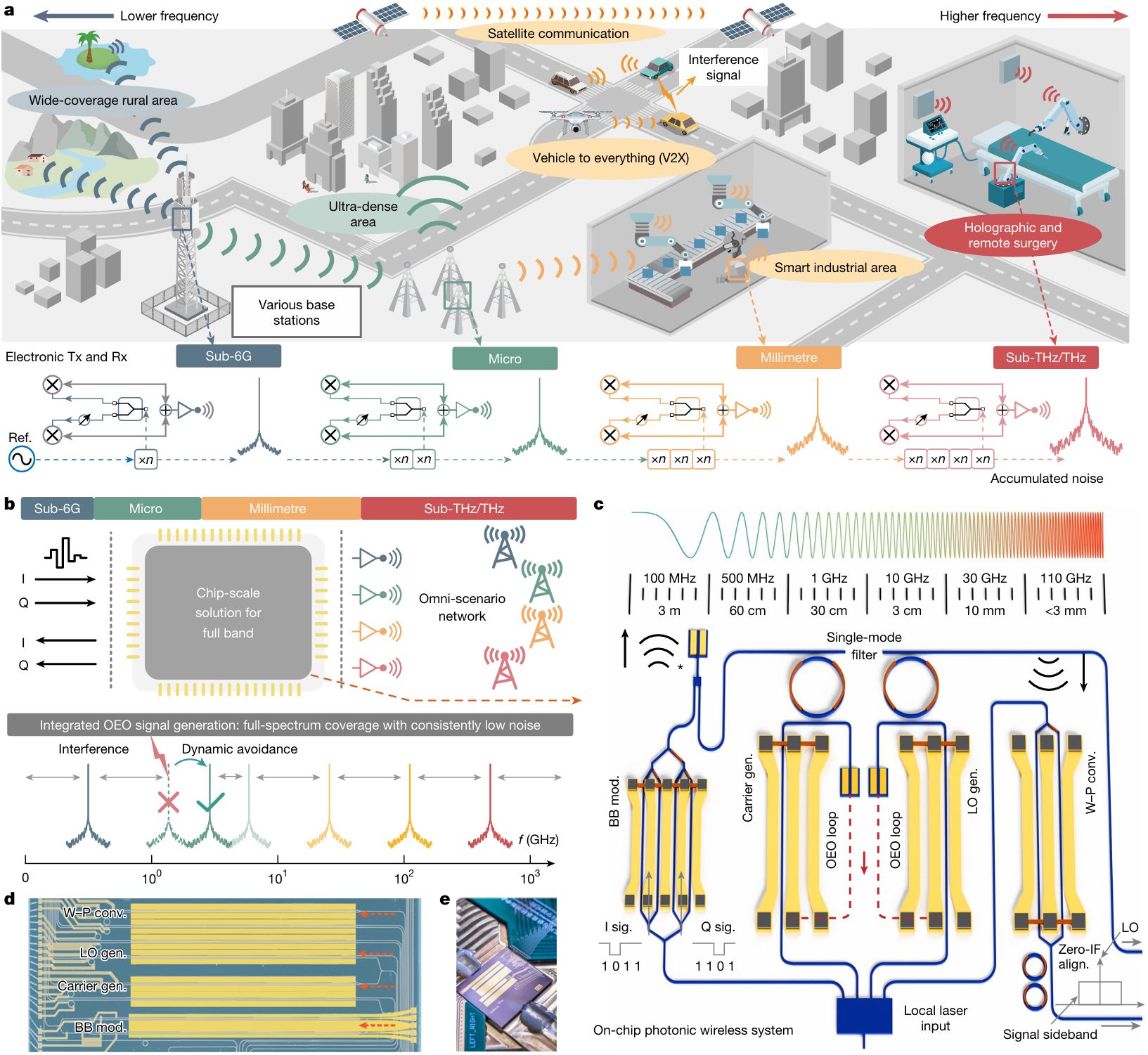 北京大學(xué)電子學(xué)院王興軍教授、舒浩文研究員和香港城市大學(xué)電氣工程學(xué)院王騁教授聯(lián)合團(tuán)隊(duì)在下一代無(wú)線通信(6G)和光電融合領(lǐng)域取得重大突破,首次實(shí)現(xiàn)基于光電融合集成芯片的自適應(yīng)全頻段高速無(wú)線通信。2025年8月27日,相關(guān)研究成果以《全頻段無(wú)線通信的超寬帶集成光電融合芯片》(“Ultrabroadband on-chip photonics for full-spectrum wireless communications”)為題,在線發(fā)表于國(guó)際頂級(jí)學(xué)術(shù)雜志《自然》(Nature)上。